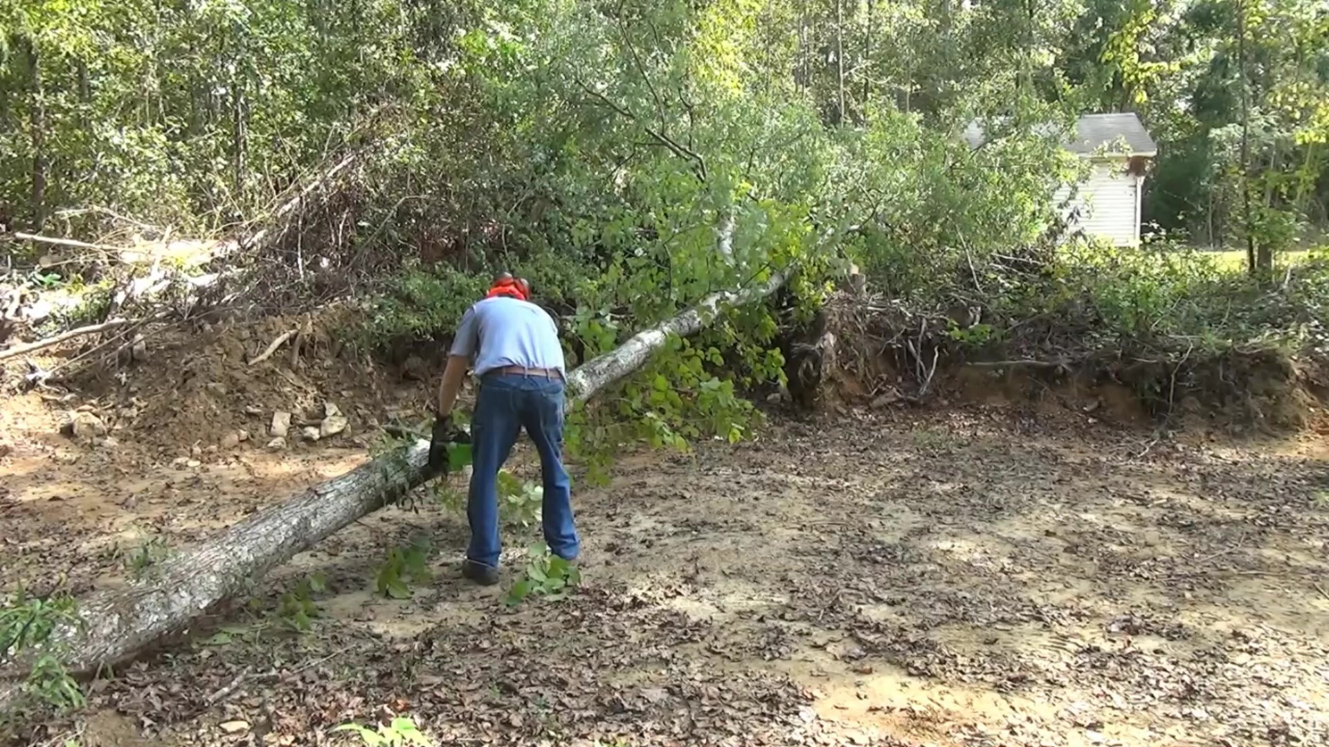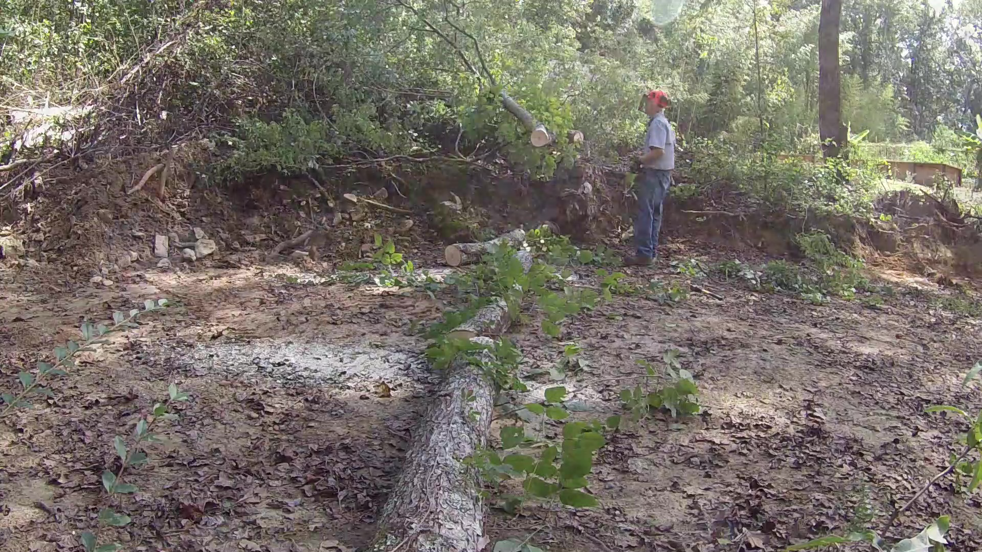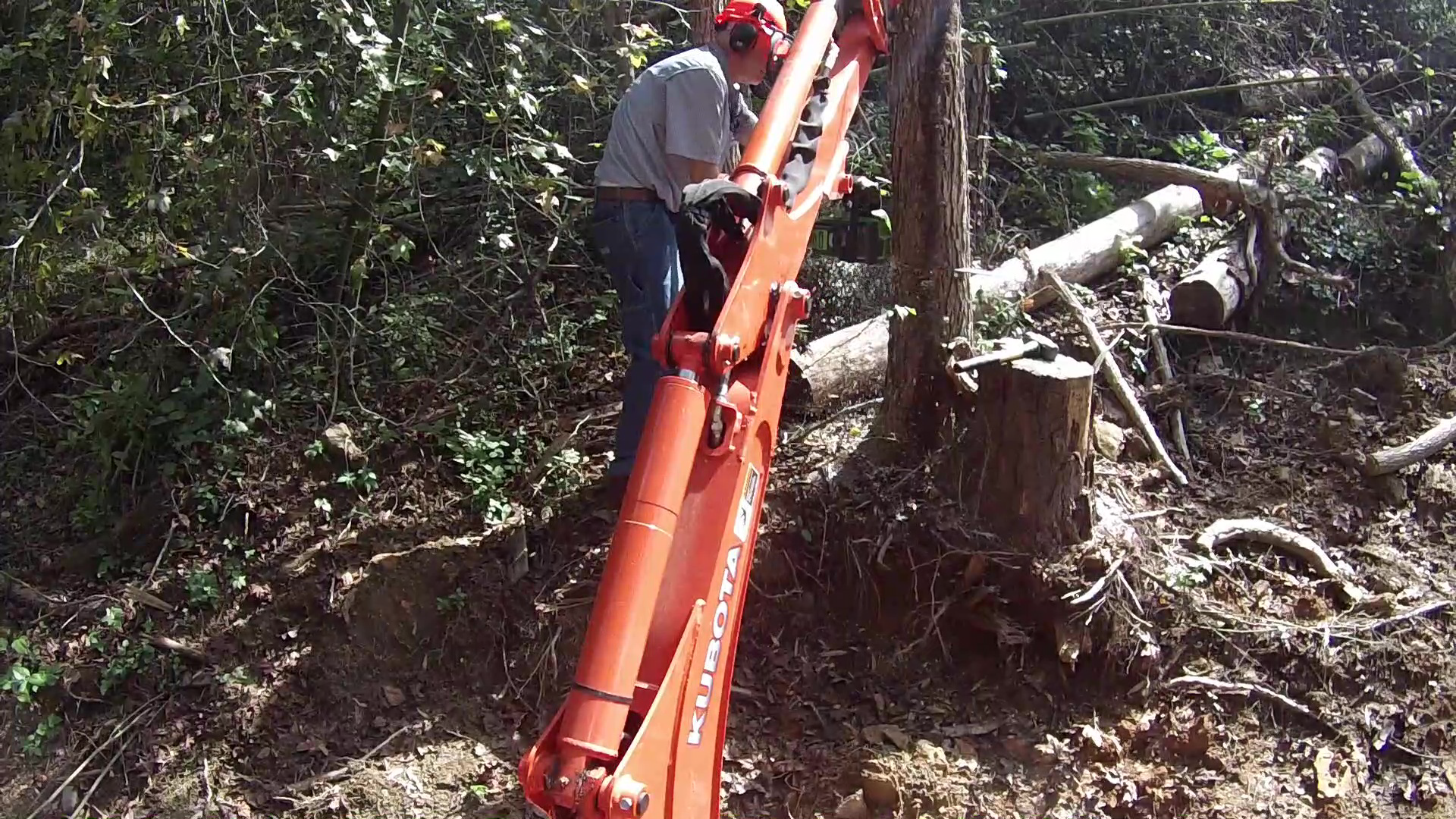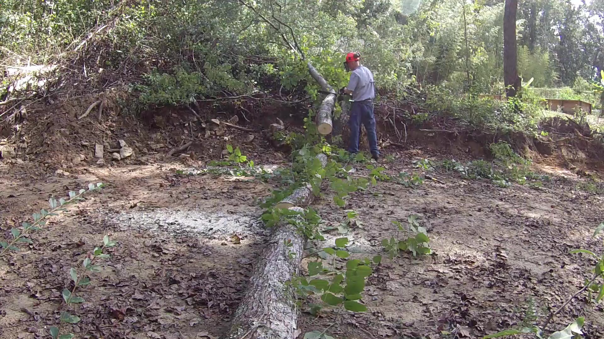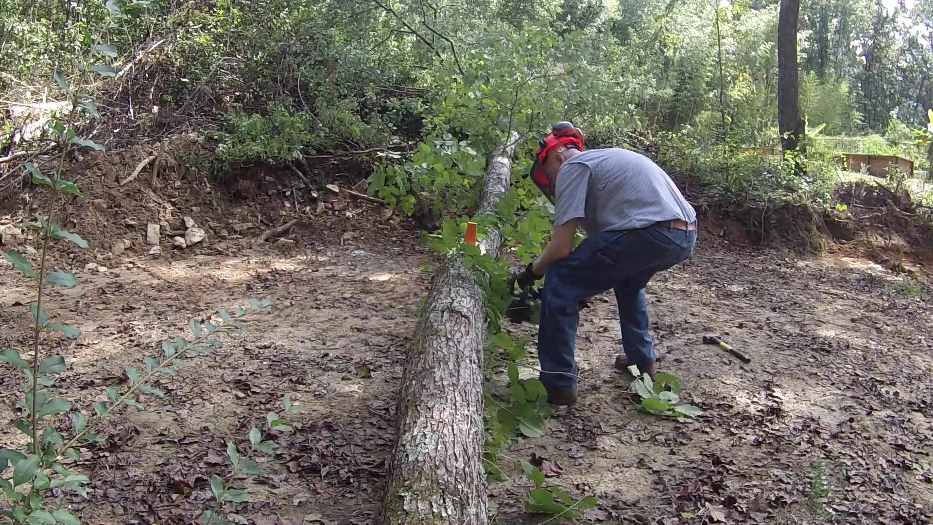 The first tree to come down was pretty straight, so I should be able to fell it wherever I want, but I gave it a little encouragement with the backhoe anyway. I was using my Greenworks 16-inch G-Max 40V chainsaw. I must admit I was very skeptical of battery powered chainsaws, but this thing has won me over.