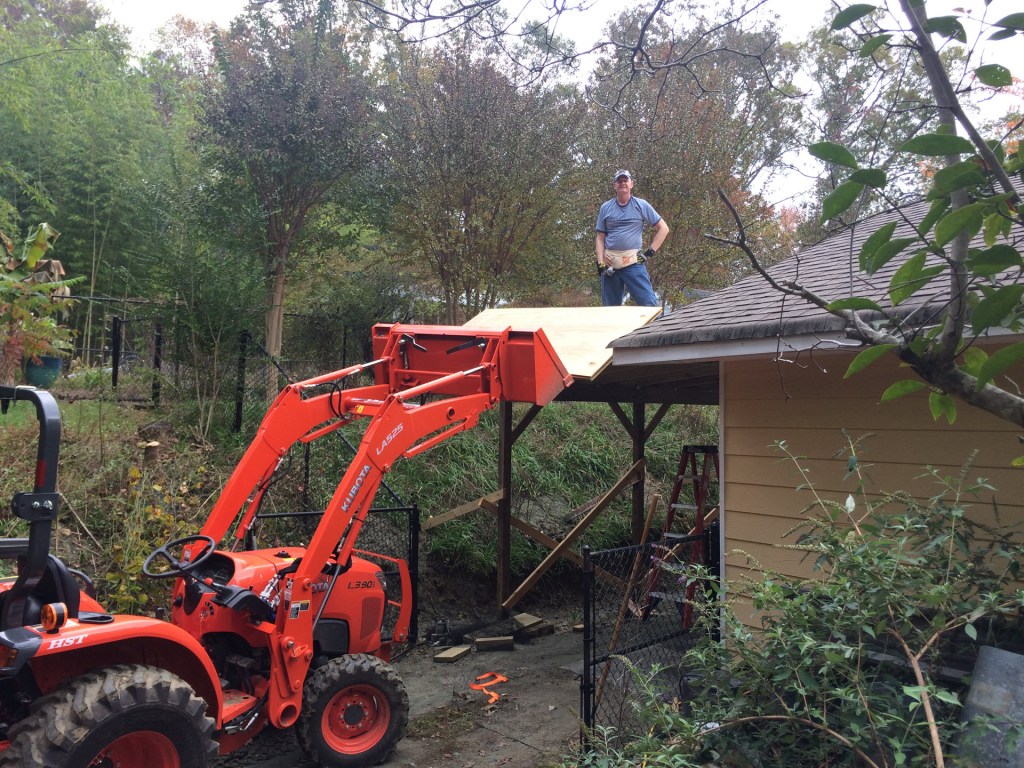 Soon after I got my Kubota L3901 (A.K.A. “Big Orange”), I knew I wanted a place to keep him out of the weather. My best option at the time was to build a lean-to shed off the back of my carport. The challenge for building this shed was getting the headroom and space I needed within space available.