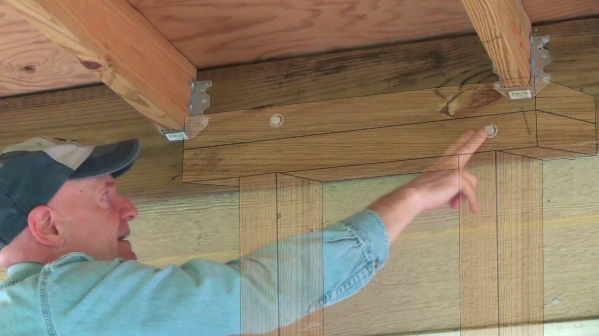 The ledger boards on the posts were mounted so that the roof would have the 5 degree pitch I wanted. They are attached using 3/8” by 4” galvanized lag screws and washers.