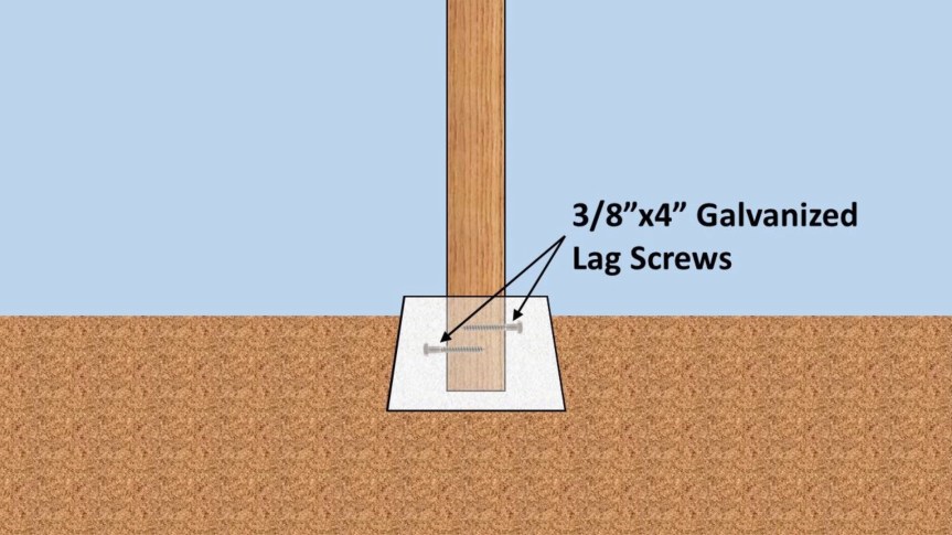 The posts were set in concrete piers and I made the pier forms from 5 gallon plastic plant pots with the bottoms cut off, which by the way was my wife’s idea and she had plenty of them to donate to the cause. I also put two 3/8” by 4” long galvanized lag screws in the bottom of each post to help anchor them into the concrete.