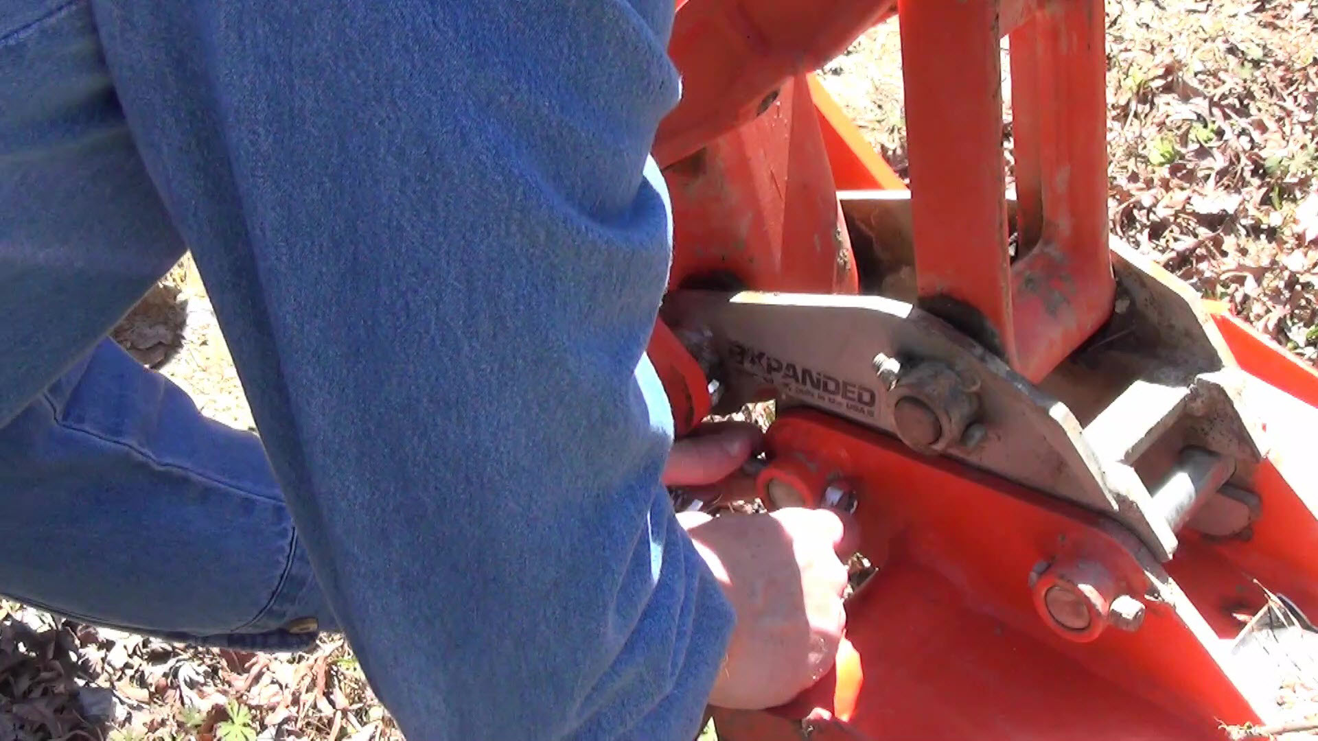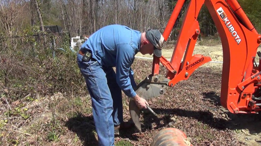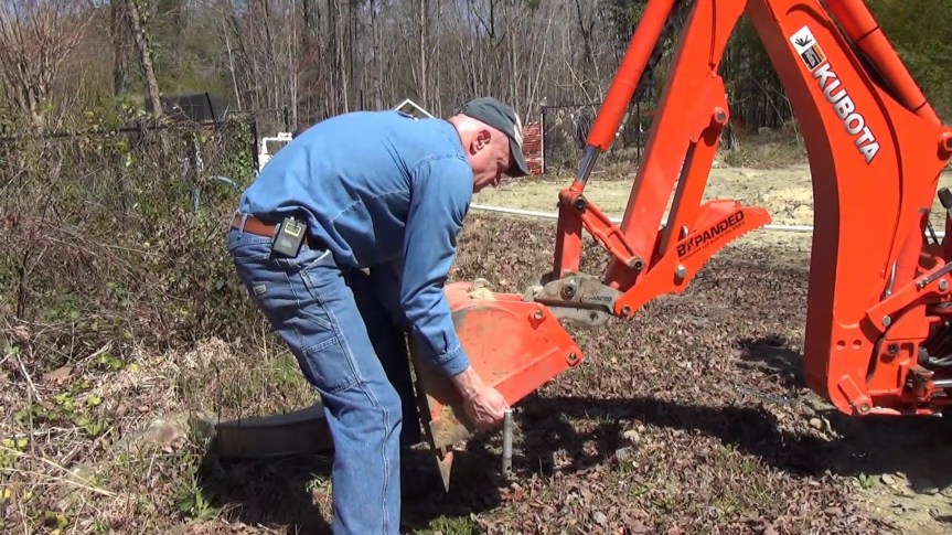 The first thing to do is switch from my 16″ backhoe bucket to the BXpanded trenching bucket. Fortunately, the BXpanded Quick-On Backhoe Connector makes this easy.