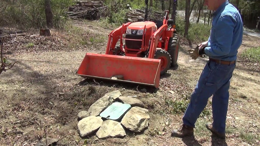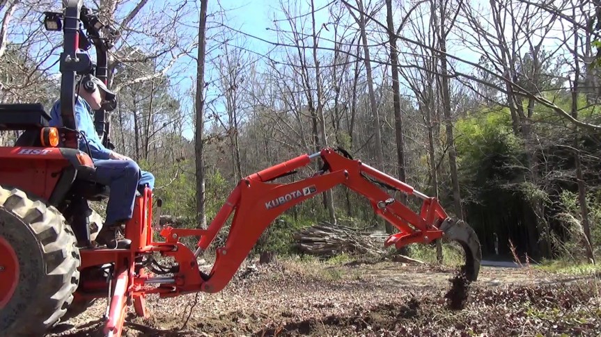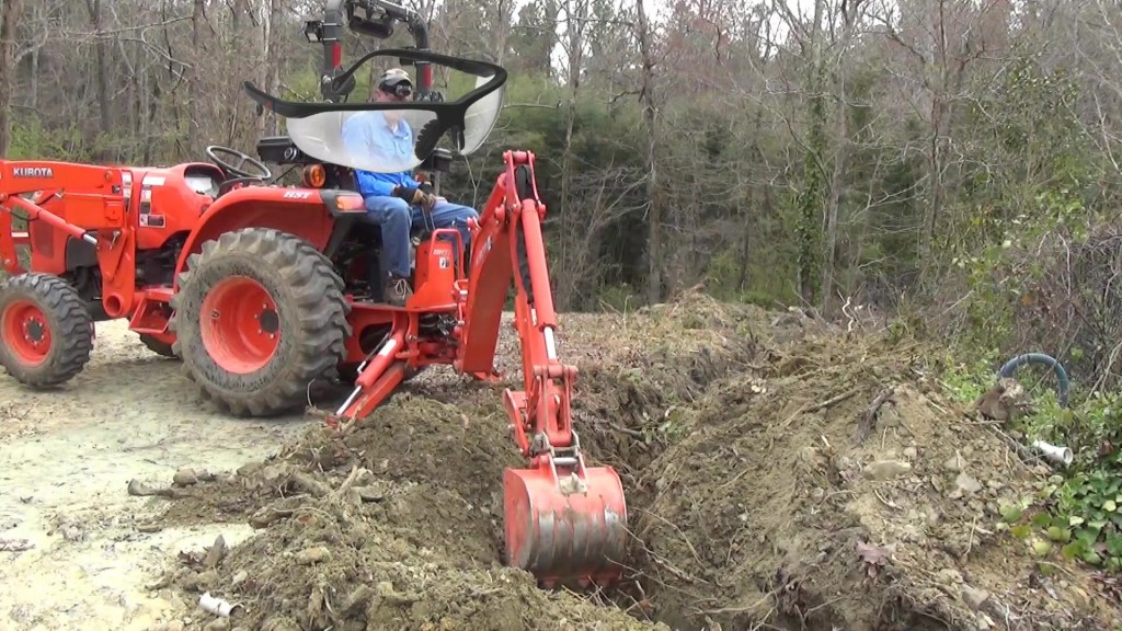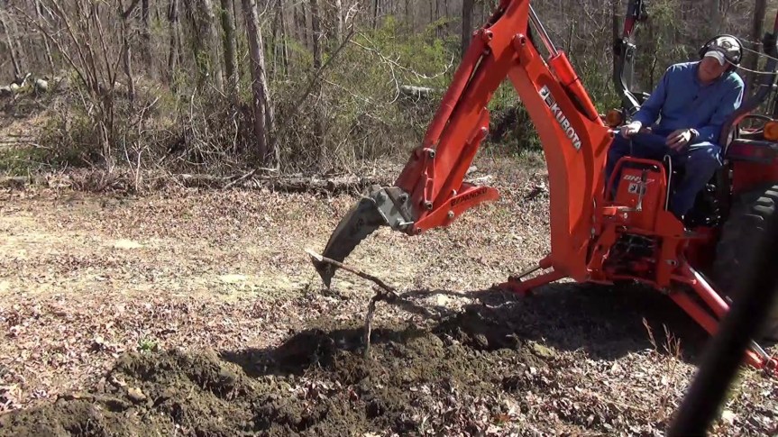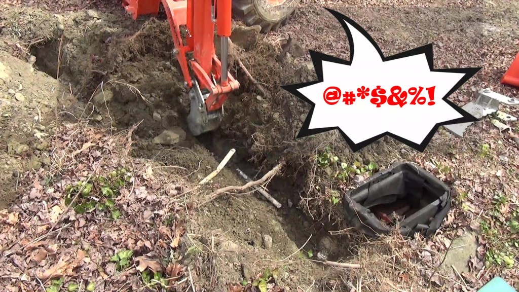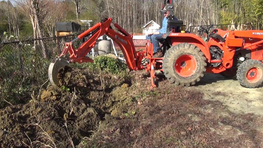 I am getting ready to build the new pool house but I don’t trust the original water line because it is thin-walled PVC and not buried deep enough in some places. So I run a new line at the proper depth using my Kubota backhoe and my BXpanded trenching bucket and backhoe ripper. But there is a big rock to deal with…
