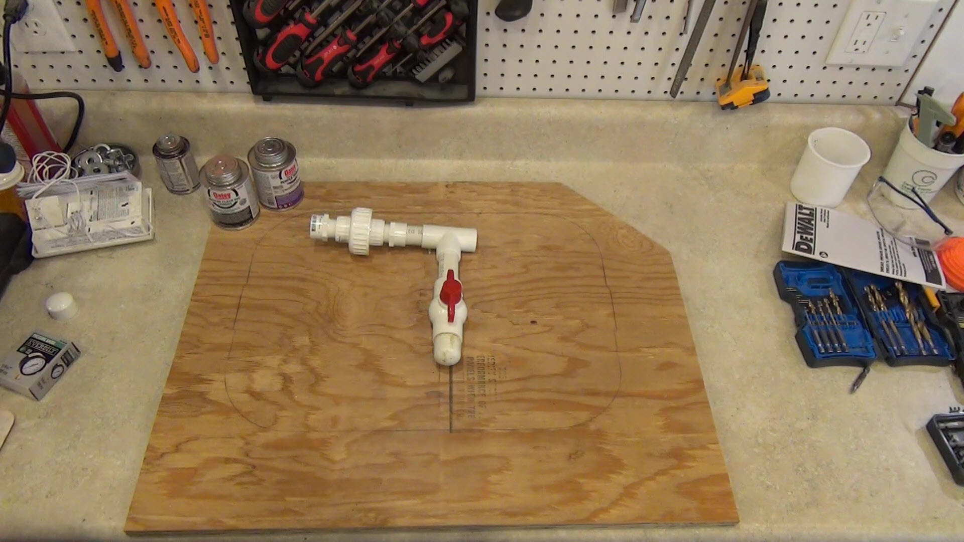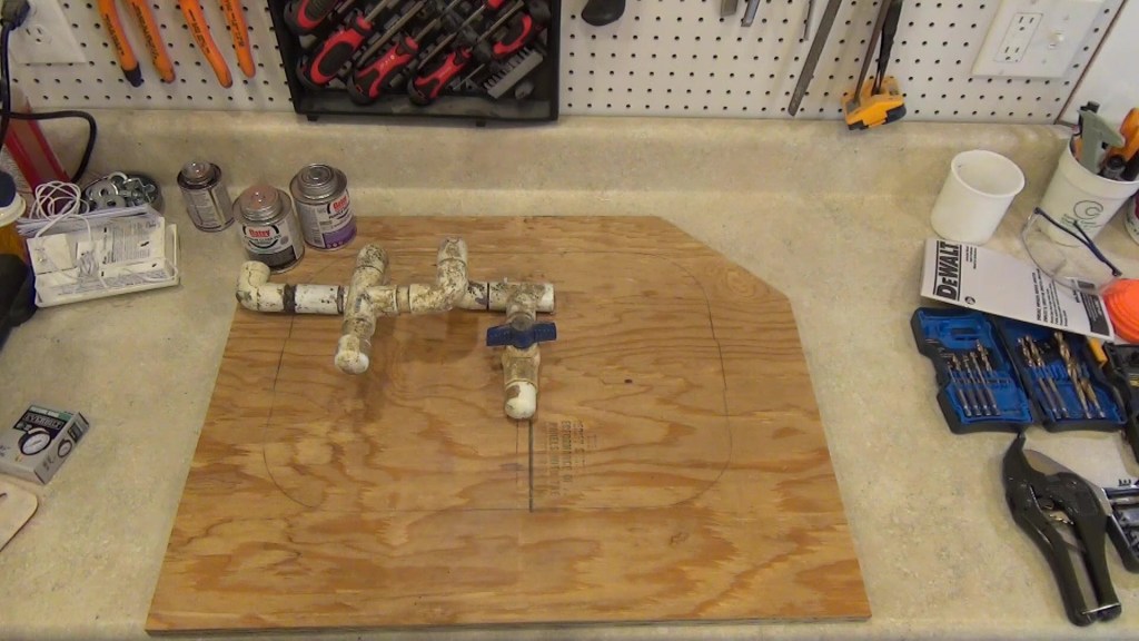 With the trench cleared, I started on re-plumbing the valve box by cutting the old piping out and taking it to my shop as a reference for building a new valve assembly. I had an outline of the bottom of the valve box on a piece of plywood to help figure out the new piping. First I recreated the drain valve, then added a union with threaded connections, which will give me maximum flexibility for any future changes I might need to make. A few short pieces of pipe pulls it all together.