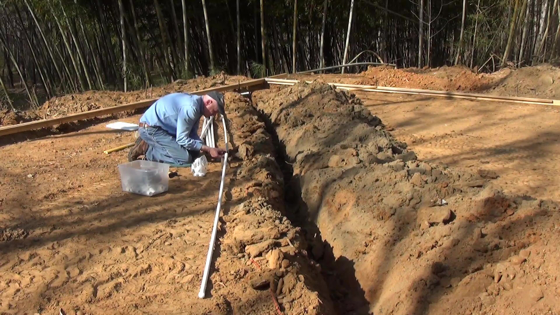 I had to dig under the form where the pipe will head off toward the pool house before gluing the last section of pipe. Then I evened out the trench with a trenching shovel and removed any stray rocks..