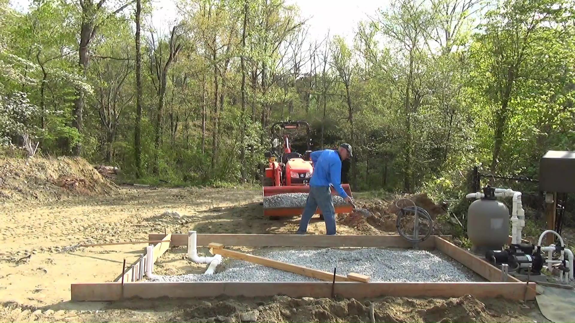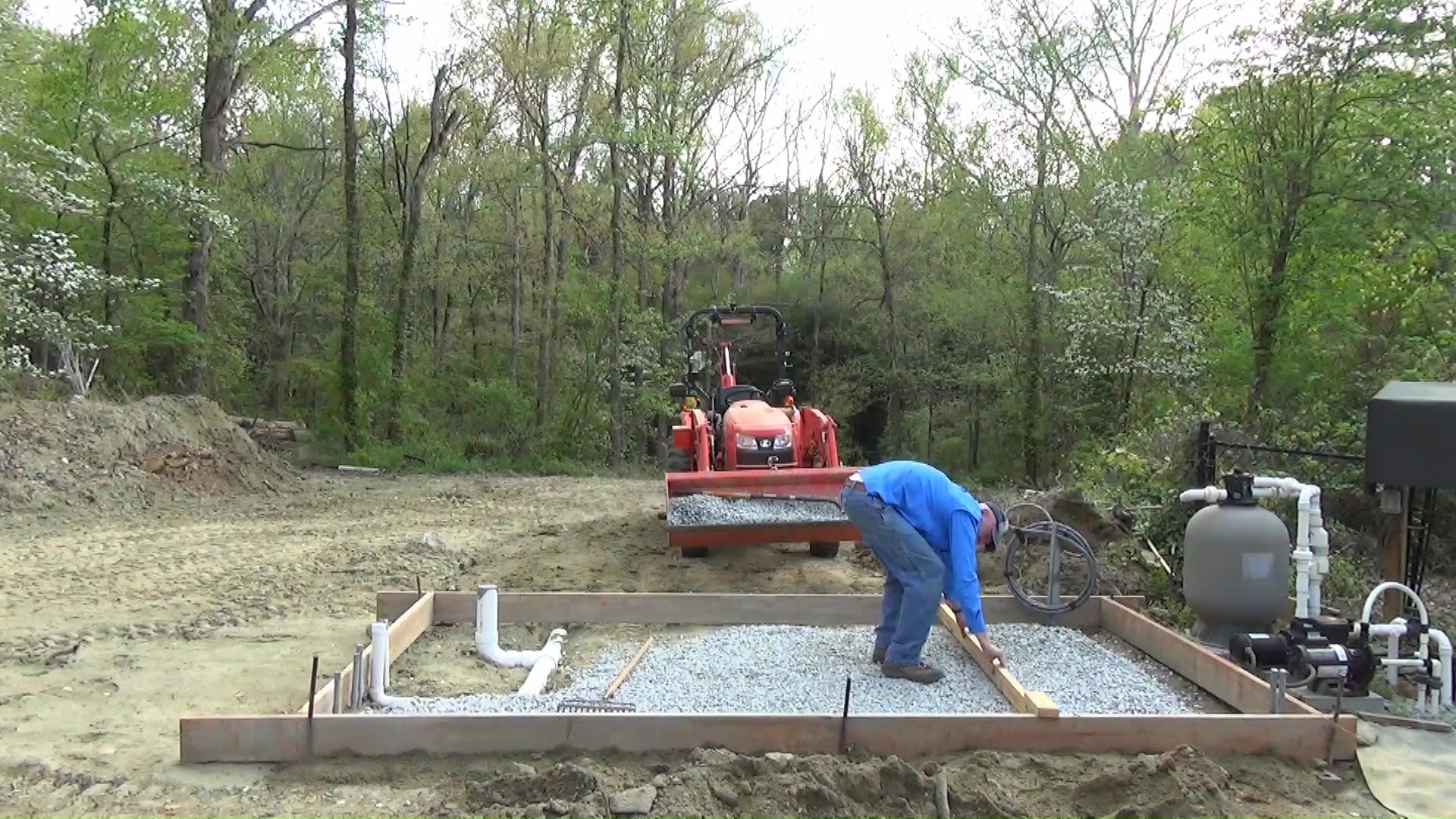 After re-attaching the rear form board, I got one more bucket of gravel to hand fill some areas and then used a screed board I made to make sure the gravel is four inches from the top of the form boards.