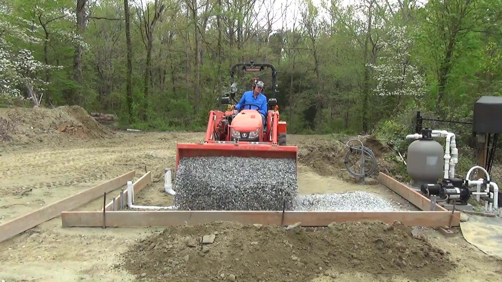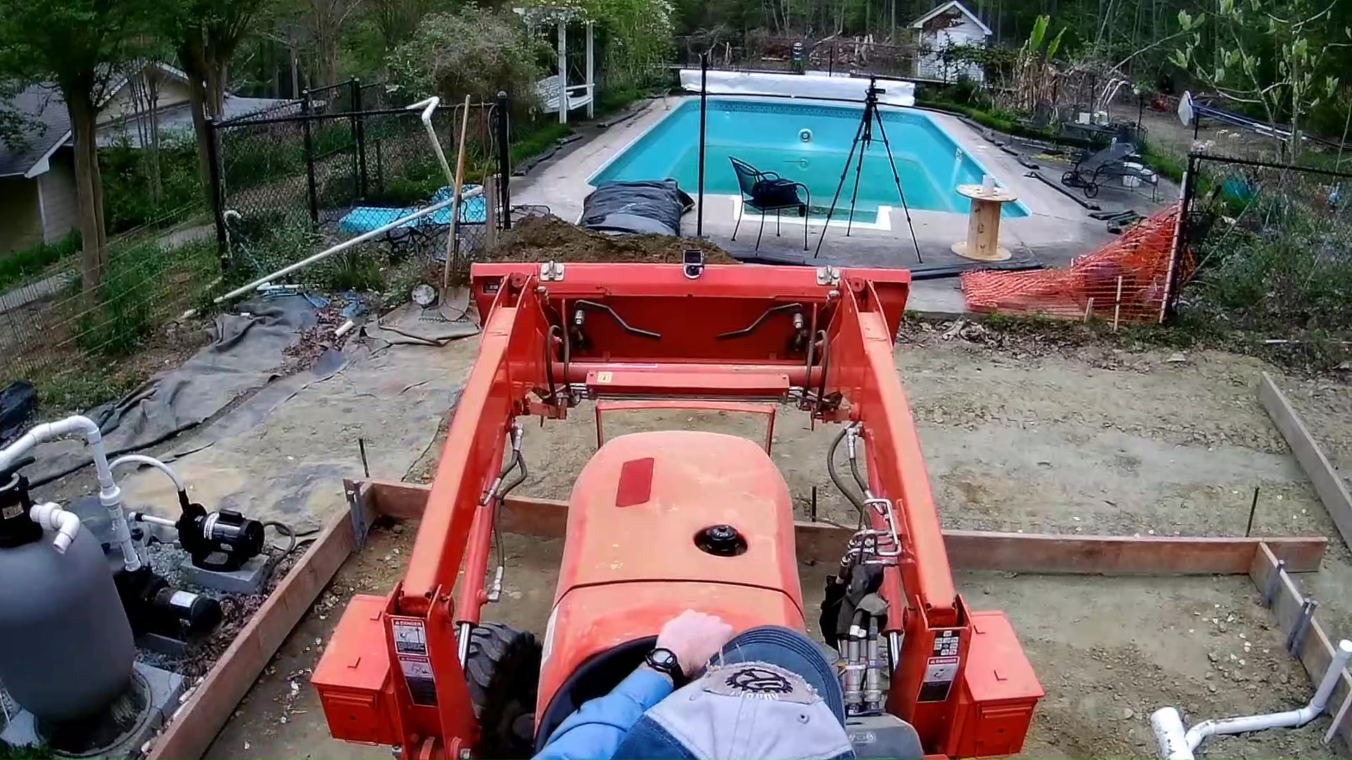 Time for some tractoring! I removed the back form board so I could dump gravel further into the form space. First, I put a couple scoops of dirt where the patio area will be to help hold the concrete on that side during the pour and to build up where the patio slab will be poured later.