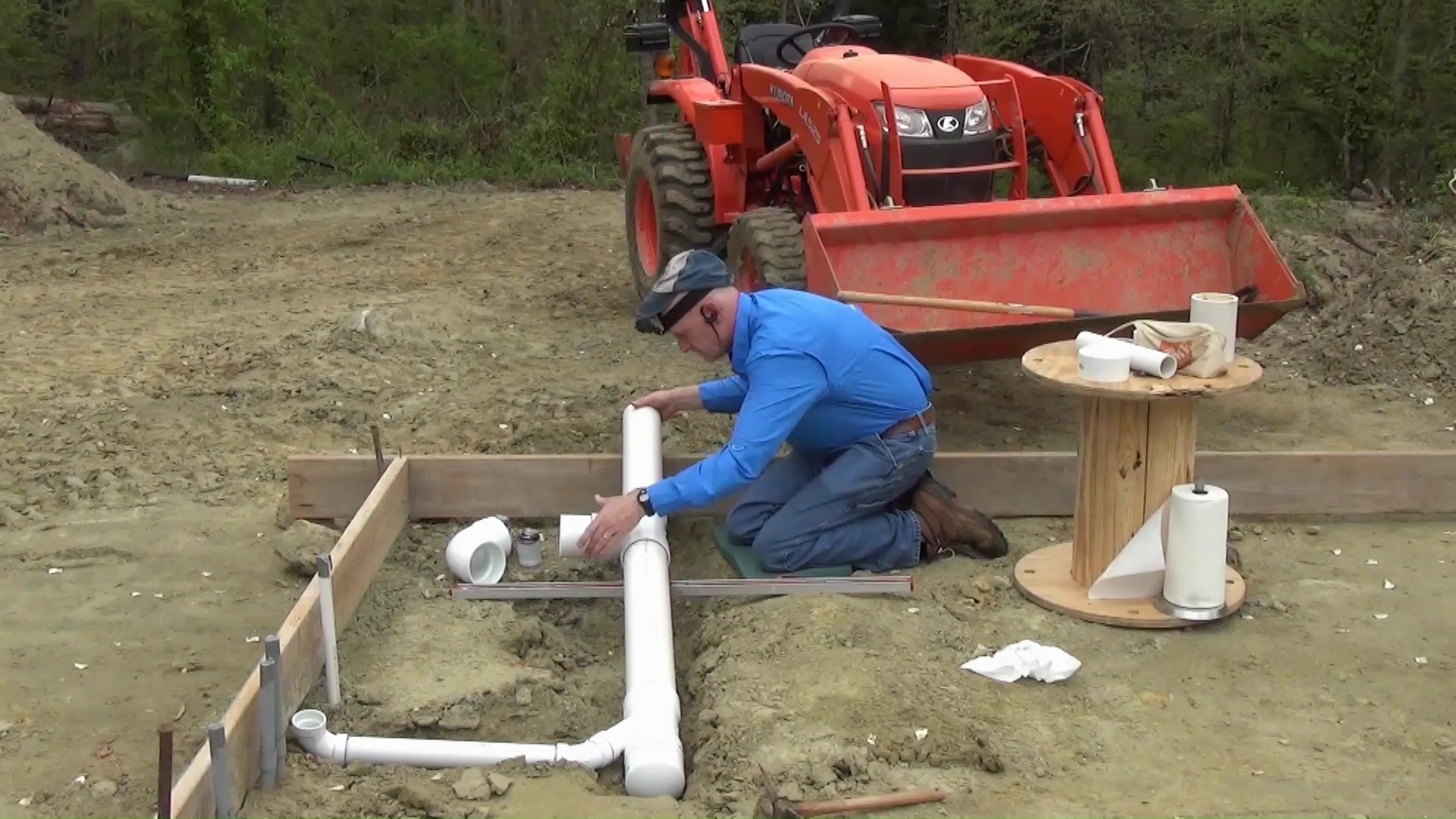 Back at the job site, I did a dry fit before gluing the pipe together, starting with the wet vent, then the toilet line, and then the section that exits the slab. A cleanout will be added just outside the slab.