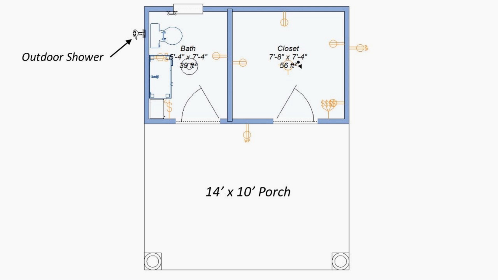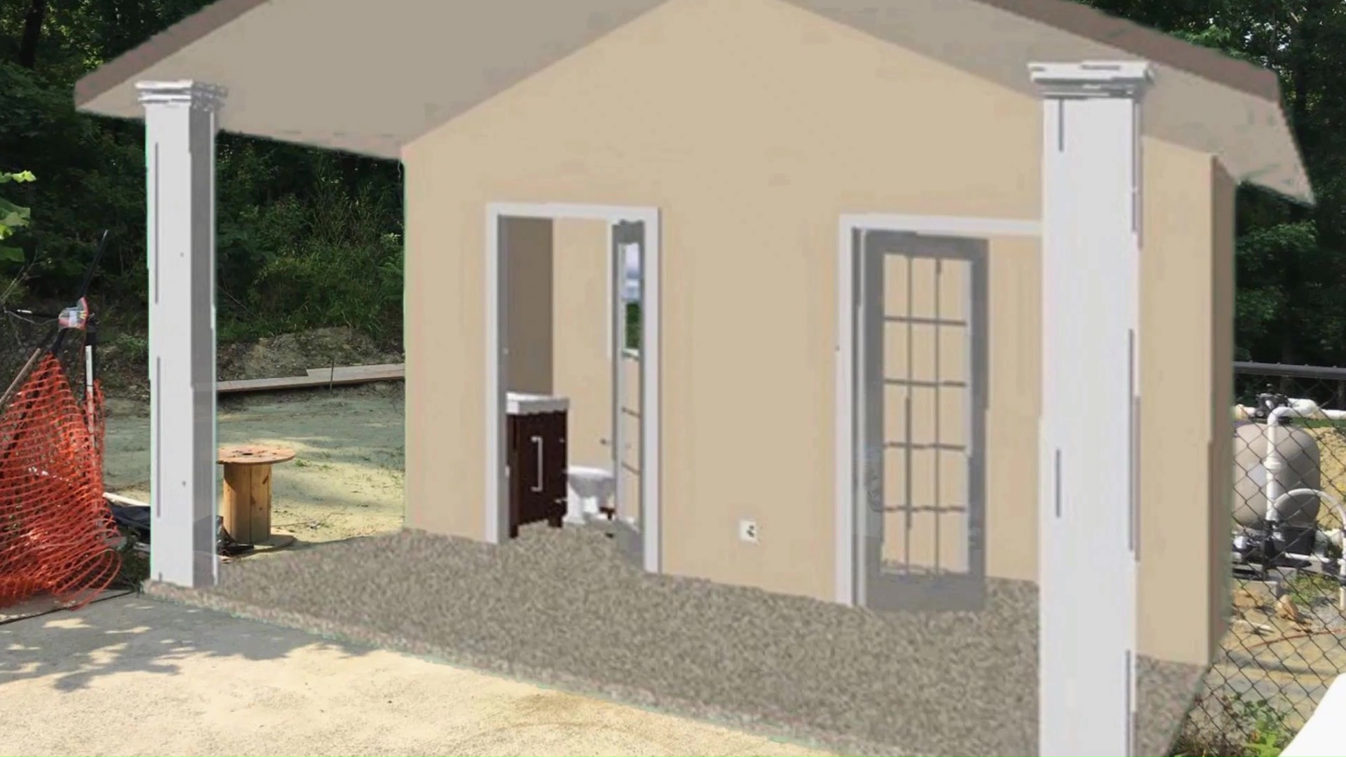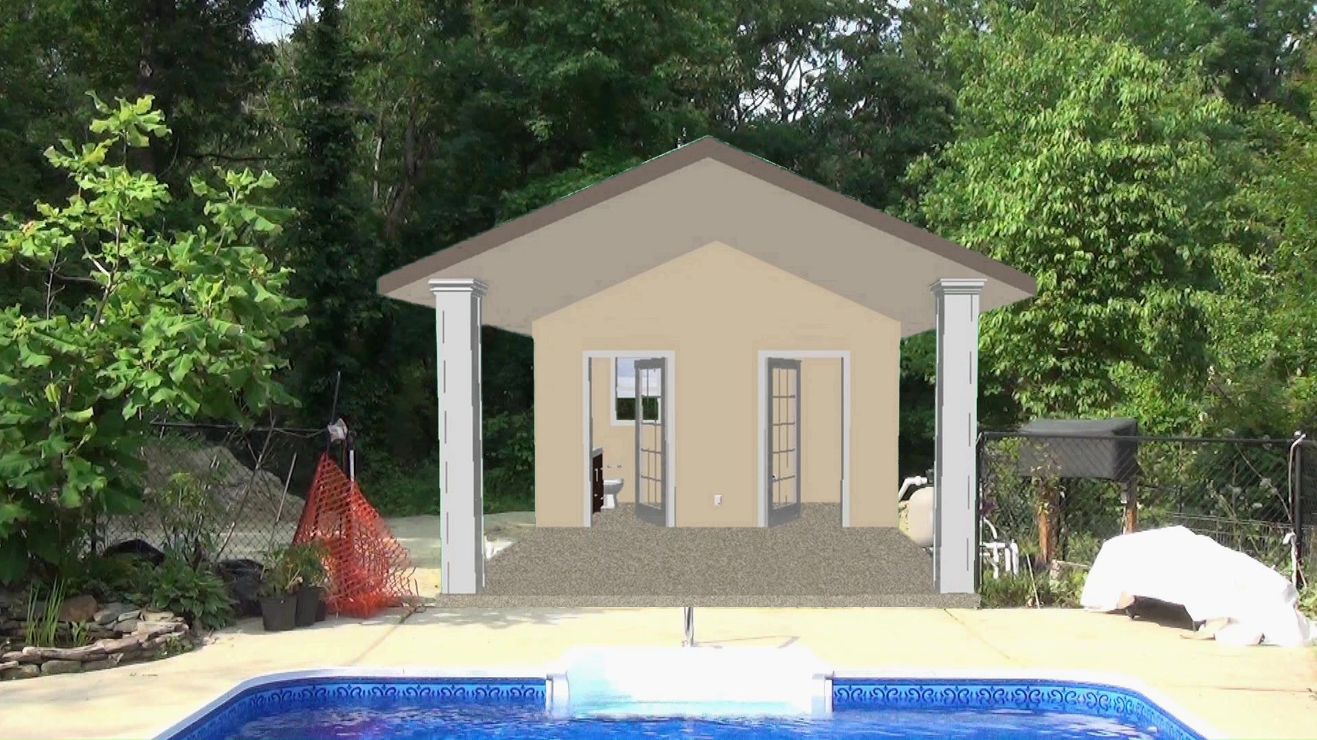 More recently, I ran a new water line to the pool house, which also branches off to provide water to my future shop building. The new pool house will look something like the pictures in the slideshow below. The software rendering is crude, but it shows the general layout but not the color or styling. It will have a powder room on the left and a storage room on the right. The styling will look much like the porch I built for our mudroom. Here’s a look at the floor plan. The building is 8’ deep by 14’ wide with a 10’ by 14’ porch.