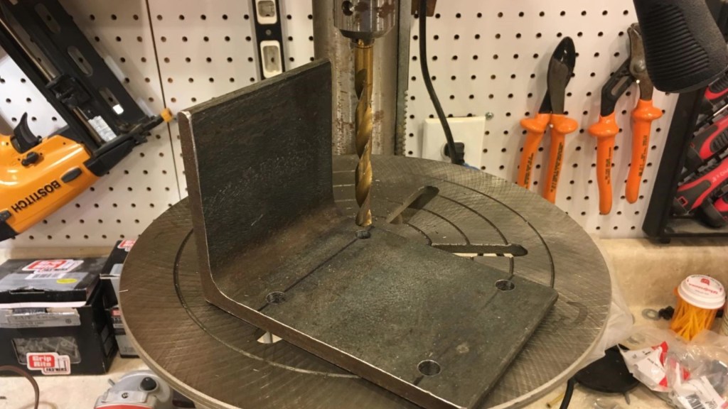 I settled on using a piece of angle iron, cut from an L-beam. Now this happens to be 3/8” thick but it certainly doesn’t need to be. It just what I could get easily and for free. This will become a versatile platform for other accessories. In this picture, I have just finished drilling the holes for the u-bolts to hold it to the ROPS.