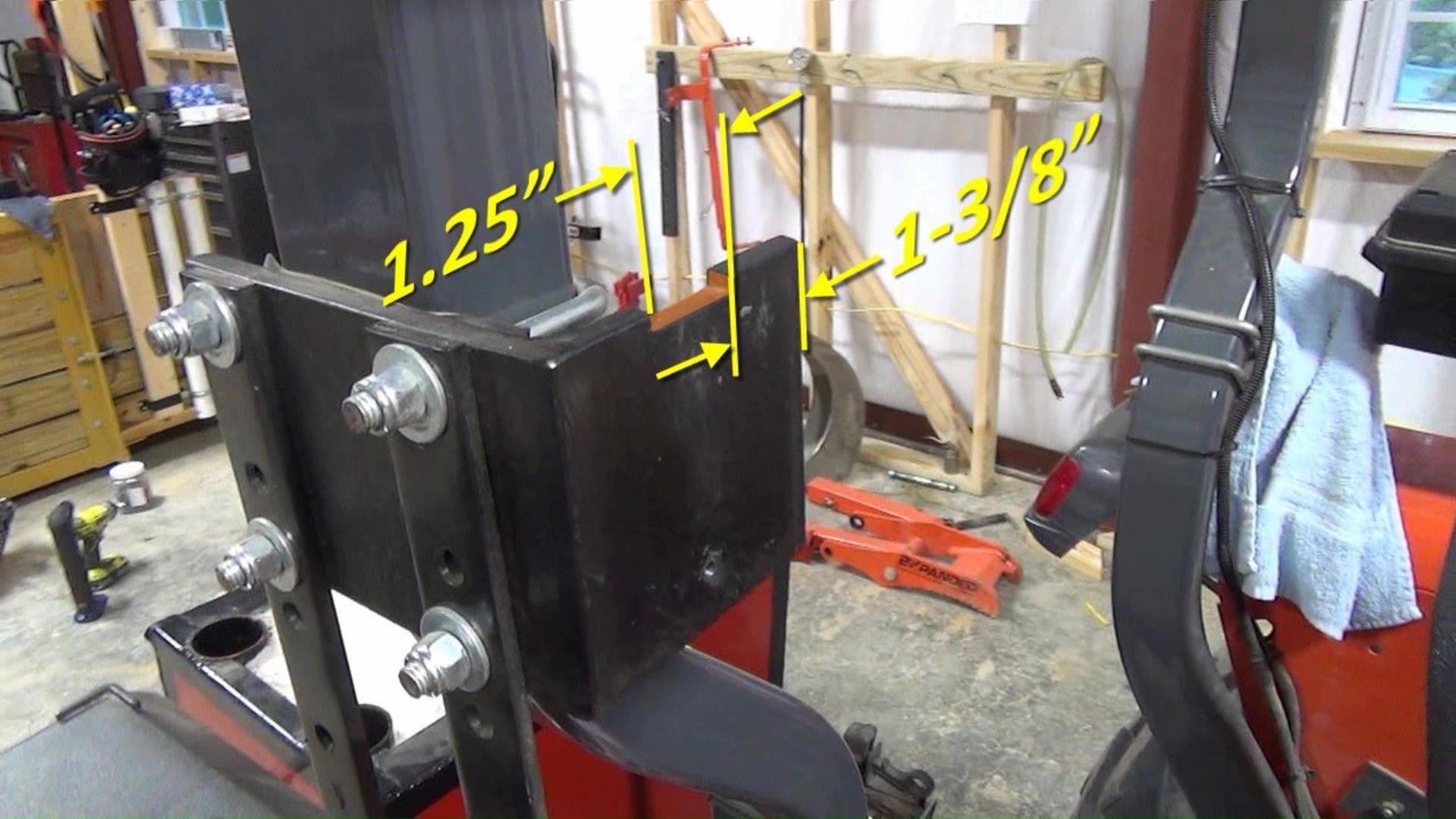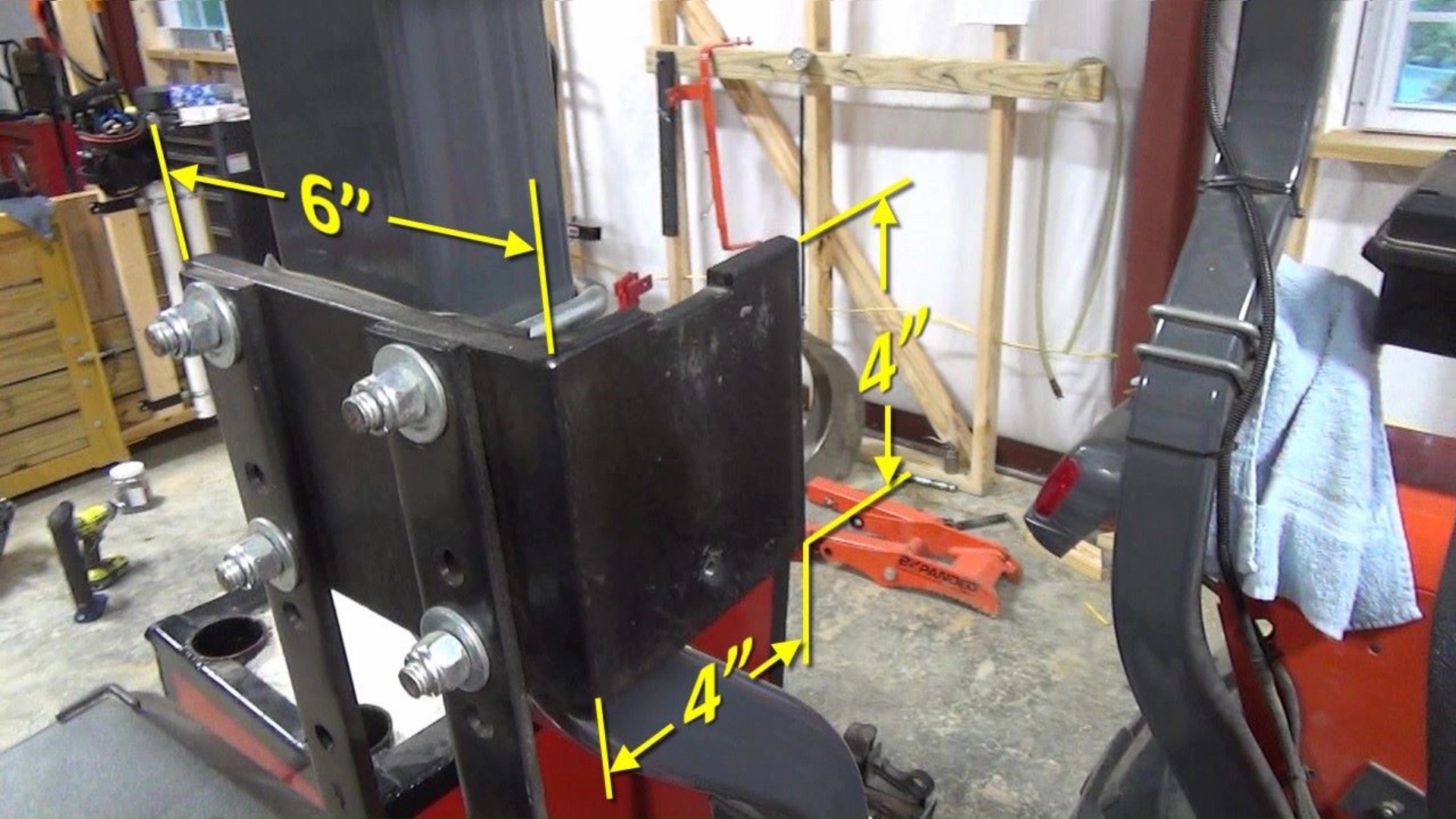 The angle iron is mounted to the left side of the ROPS, just above the bend. It is 4” tall and the front face is 4” wide. And it is 6” long. I cut a notch in the top of the face 1 and a quarter inches wide and 1-3/8” form the edge which centers it. The notch is 3/16” deep.