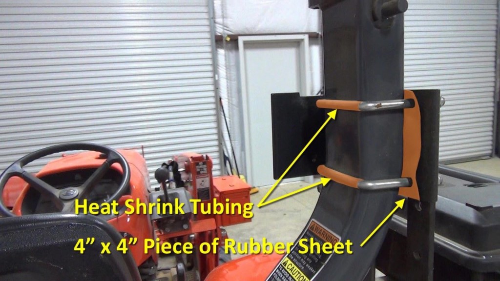 To protect the ROPS finish, I cut a 4 by 4 inch piece of rubber sheet from a pond liner scrap to go between the angle iron and the ROPS. I also put pieces of heat shrink tubing on the u-bolts for the same reason.