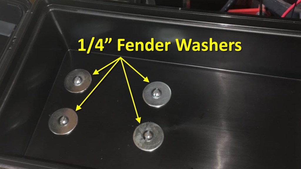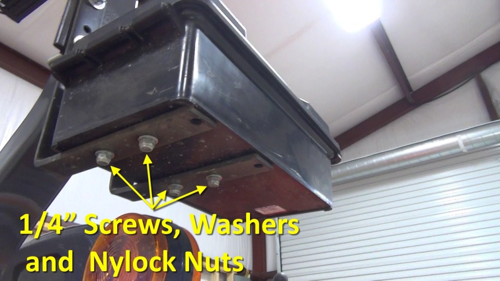 The other ammo can is mounted on two 10” by 10” by 1” steel corner braces, which are mounted on the same U-bolts that hold the fan bracket to the ROPS. The top holes were drilled out to 3/8” to fit the U-bolts. I had to drill two extra 3/8” holes in the corner braces to match the U-bolt spacing. The horizonal arms of the corner braces were cut to 7.75” and the ammo can is mounted starting near the rear of the can. I used quarter inch screws, washers and nylock nuts through existing holes in the corner braces to mount the ammo can to the corner braces. On the inside of the can, I used quarter inch fender washers with the screws to firmly secure the can to the corner braces.