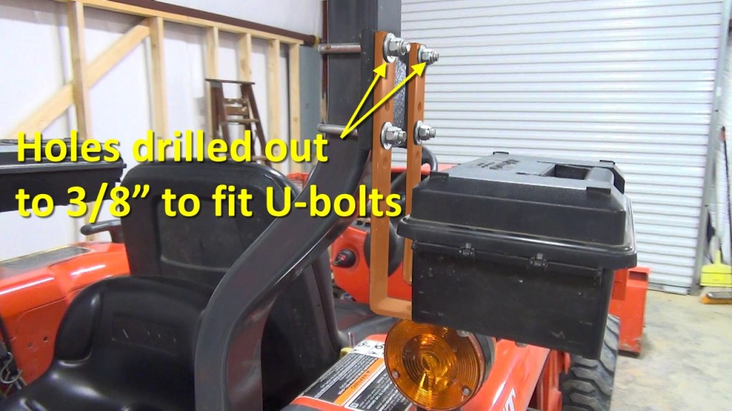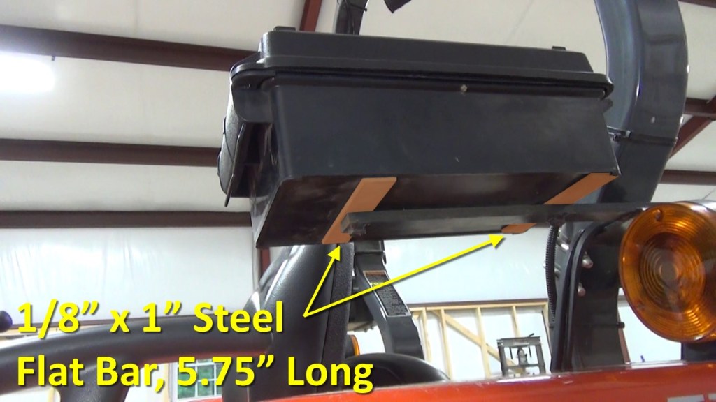 To mount the ammo can to the support arm, I used the same bolts that held the stock Kubota toolbox to the support arm. On the underside, I cut two pieces of 1/8” by 1” steel flat bar, 5.75” long to provide solid support for the ammo can.