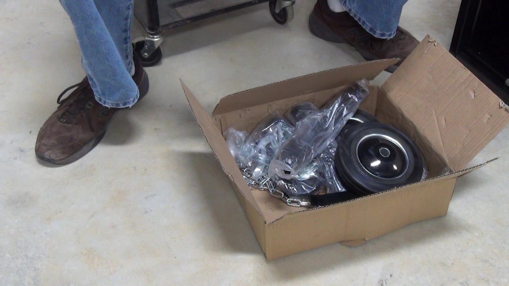 The box contained all the hardware needed to assemble the welding cart, including the large rear wheels, a gas bottle rack, the hose and lead hooks, the other gas bottle rack, the front swivel locking casters, the chains for holding the gas bottle securely to the cart, and finally the package of screws, bolts and washers. I’m happy to say there was nothing missing.