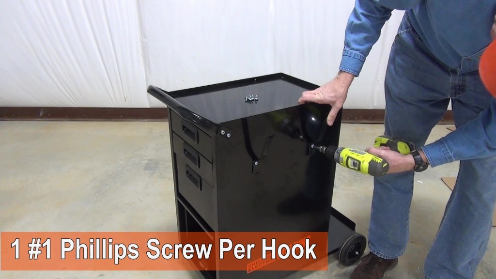 The handle attaches with 4 #1 Phillips screws. The bottom of the four side hooks fit in slots in the side of the cabinet and attach with one screw each.