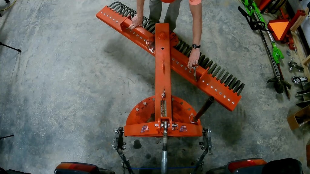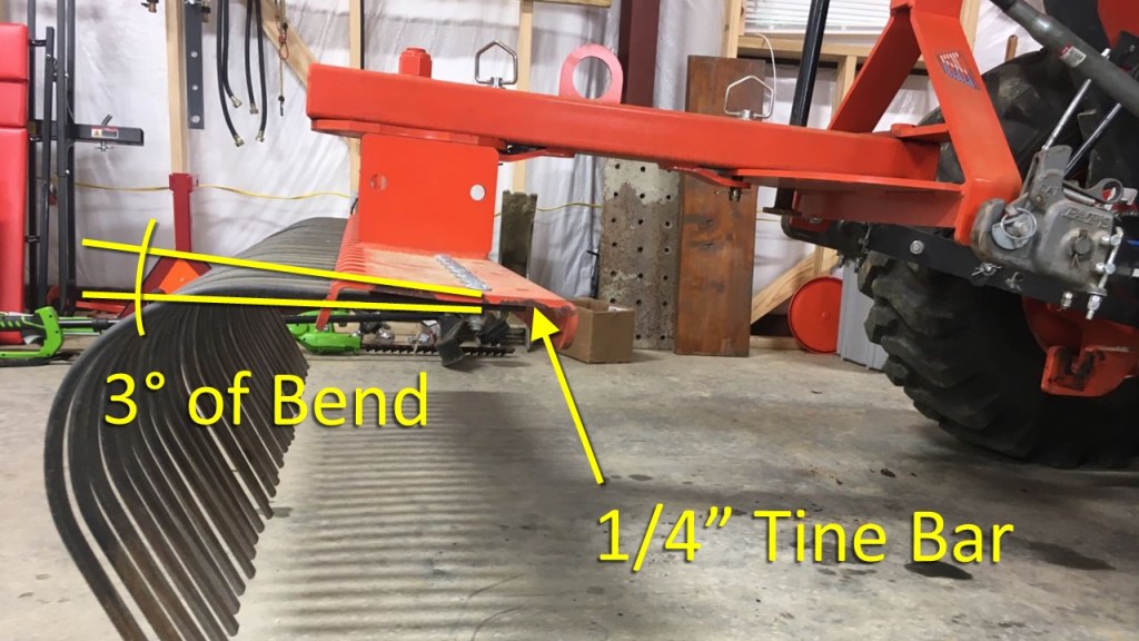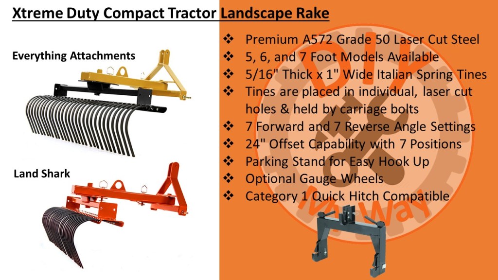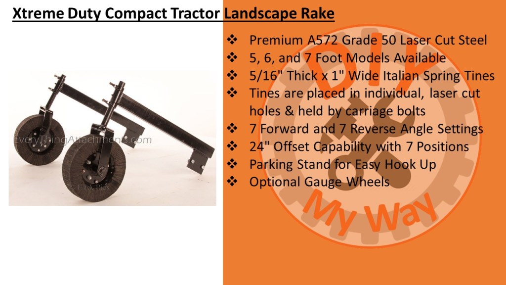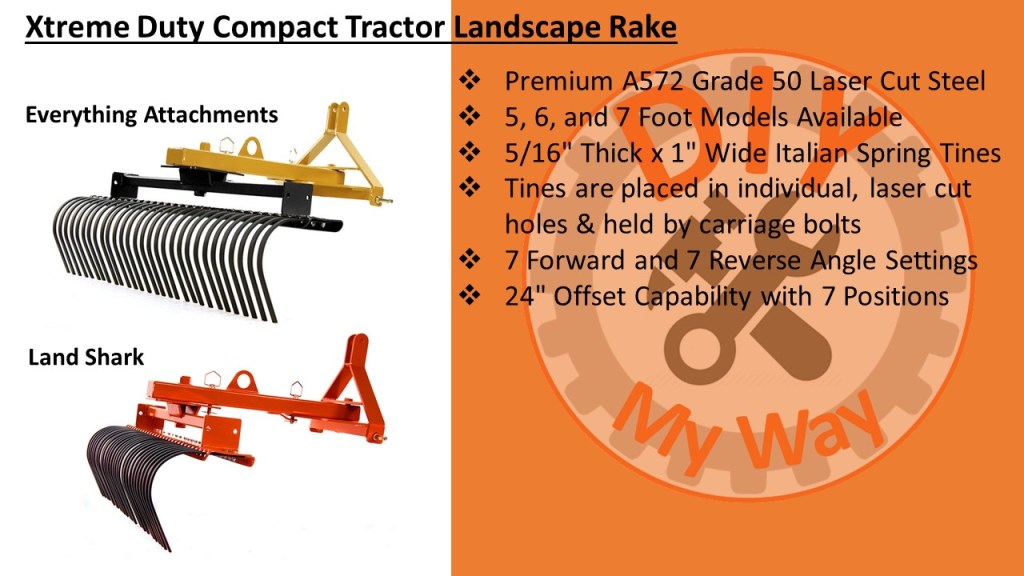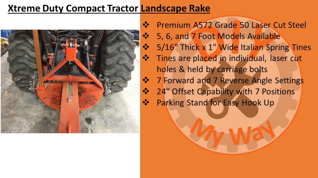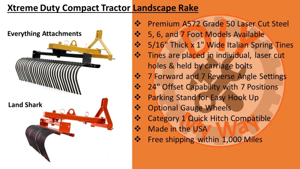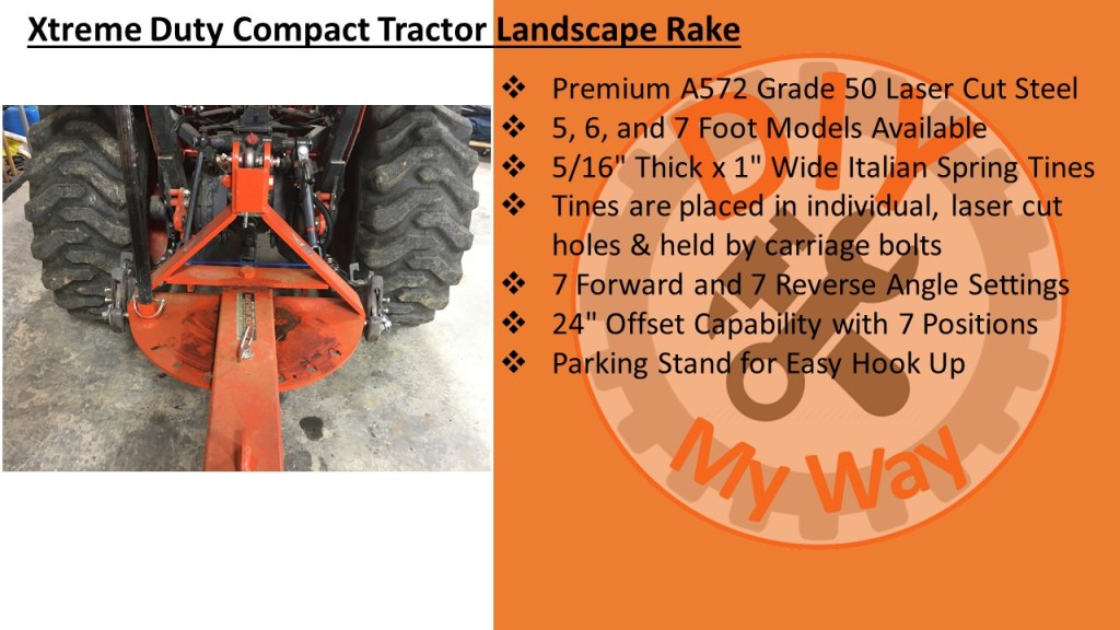 According to the websites, the Xtreme Duty Rake is made from premium A572 Grade 50 Laser Cut Steel. It is available in 5, 6, and 7 foot wide models. The tines are made from 5/16” thick and 1” wide high-quality Italian spring steel to resist breaking and bending. The tines are placed in individual, laser cut holes & held in place by carriage bolts for easy replacement. There are 7 forward and 7 reverse angle settings. And my favorite feature is it has a 24″ offset capability by simply removing a pin and swinging the rake over to one side. There is a parking stand for easy hook up to your tractor. You can also get optional gauge wheels to control the depth of the tines. It is category 1 quick hitch compatible. The rake is made in the US in Conover, NC and shipping is free within 1,000 miles.