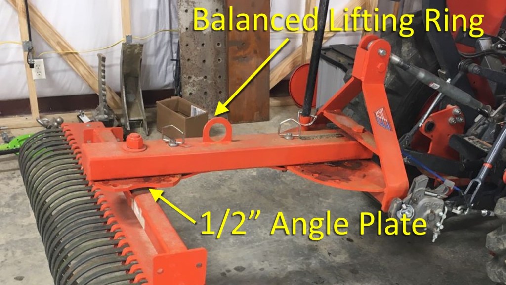 This thing is built like a tank! The 3-point frame is made from ½” steel bar. The Offset angle plate is 3/8” thick. And the swing arm is made from 3/16” thick 3×5”rectangular steel tubing. The tine bar angle plate is ½” thick. And there is a balanced lifting ring.
