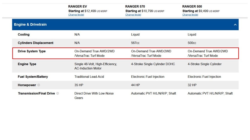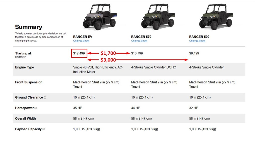The best way to evaluate the specs of the Ranger EV is to compare it to models with similar specs, which are the popular Ranger 570 and the Ranger 500. I used Polaris’ comparison tool on their website to highlight the key differences.