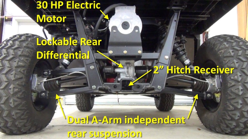 Looking at the rear, you’ll find the 30 HP AC electric induction motor. Noticed I said AC and not DC. That because the eight 12V batteries are wired to provide 48V DC which is then converted to AC so that the motor can be brushless, which makes it essentially maintenance-free. The rear differential is lockable when you need extra traction. Here’s the Dual A-Arm independent rear suspension. And there’s also a 2” hitch receiver.
