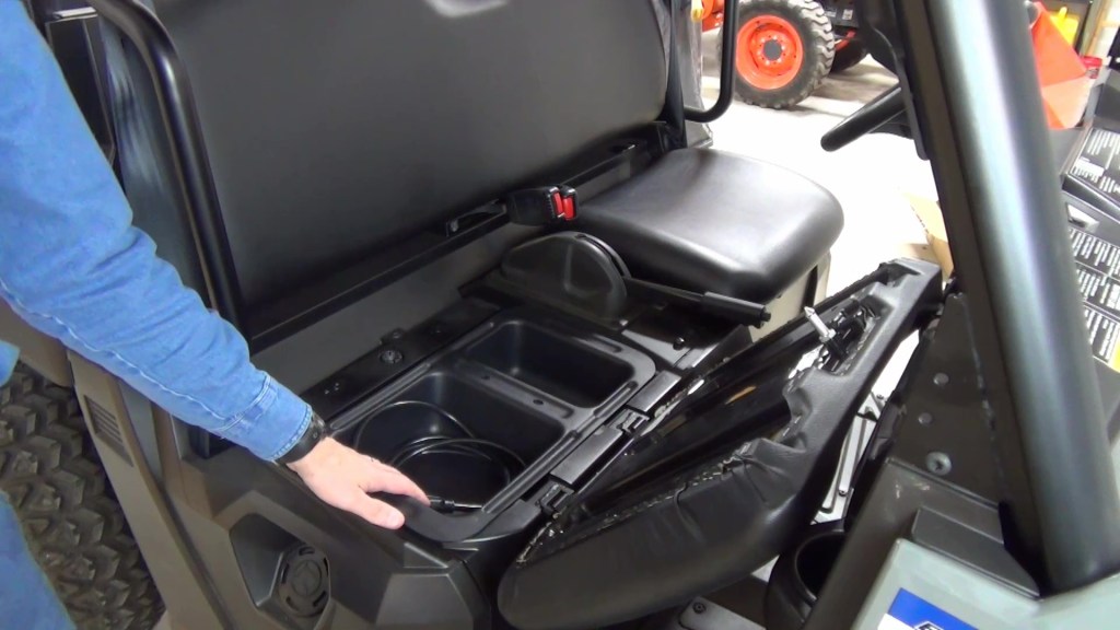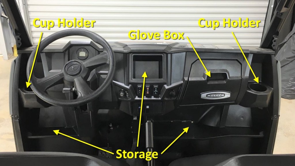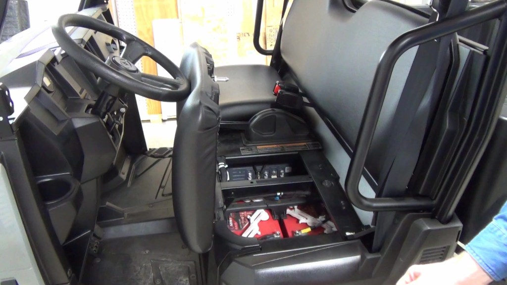 The trays are removable for access to the batteries and are held in place with Velcro strips. Under the driver’s seat, I keep a pair of gloves, and some LockNRide ties downs for the cargo box. Again, the tray is removable for battery access.