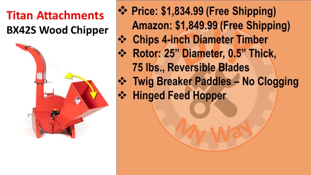 First let’s cover the specs on the BX42 woodchipper. The price on the Titan Attachments website is $1,834.99 with free shipping. But Titan also sells it on Amazon for $1,849.99 with free shipping, so it’s slightly more on Amazon, but if you already have an Amazon account, it may be worth it not to have to set up an account with Titan. I own several Titan implements and I have found that the prices do vary between Amazon and Titan direct. Sometimes, it’s a better deal on Amazon and sometimes it’s better directly from Titan, so check both. By the way, here a link to the owner’s manual, which I recommend you read if you are considering buying the chipper.