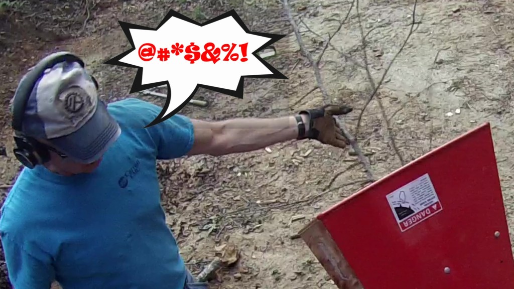 The feed chute as two heavy flaps to discourage pieces of wood from flying back at you, but this doesn’t always work as you’ll see later in the video. As a general rule, you don’t want your hands to go past the flaps while feeding limbs into the chipper.