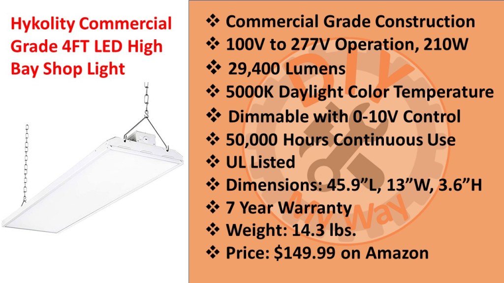 The 4ft LED High Bay Shop Lights I chose are made by Hykolity, an LED lighting manufacturer based in California. The specs of the fixture I chose include: