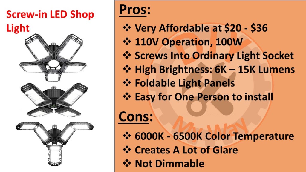 Another type of fixture worth considering is the screw-in type with adjustable light panels. These fixtures come in several different designs – like the ones you see here. They are very reasonably priced, ranging from $20 to about $36. They operate on 110V, typically consuming 100W, and screw into ordinary light bulb sockets. They offer high brightness from 6K lumens to 15K lumens. And of course, one of their best features are the adjustable light panels which let you determine how wide of an area you want to illuminate. Also, they are easy to install, especially if you already have light bulb socket on your ceiling. If I were picking one, I’d choose one with a least 4 adjustable panels and a center light for maximum coverage.